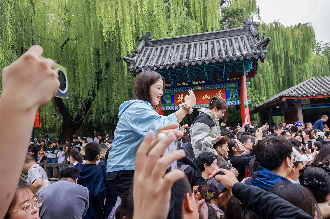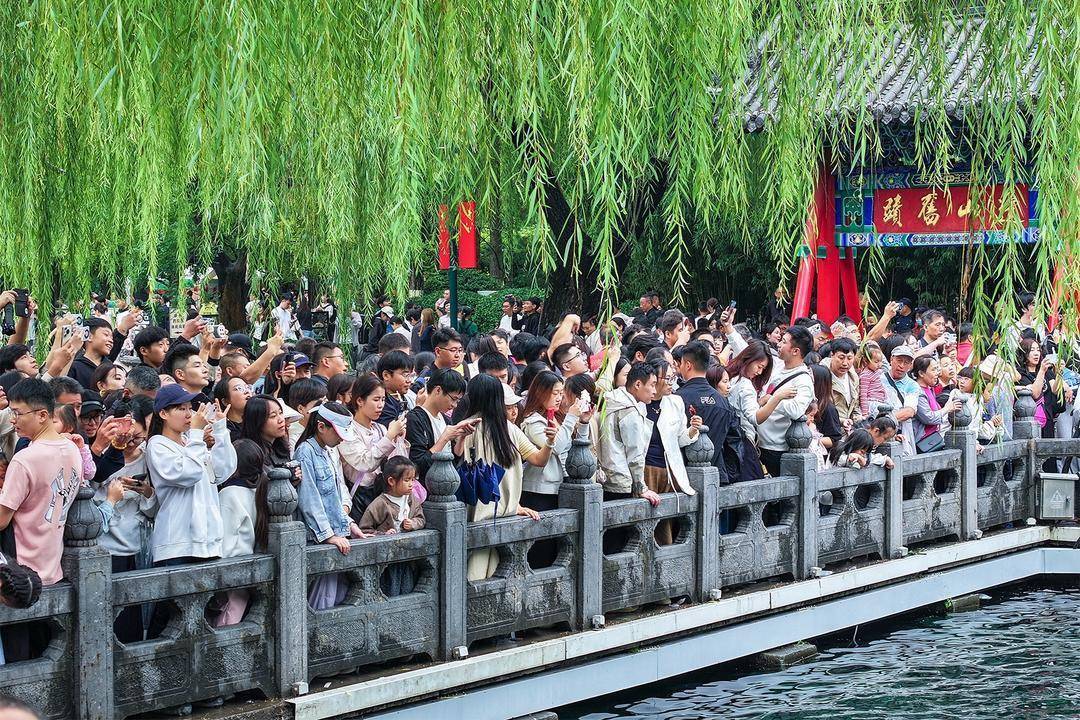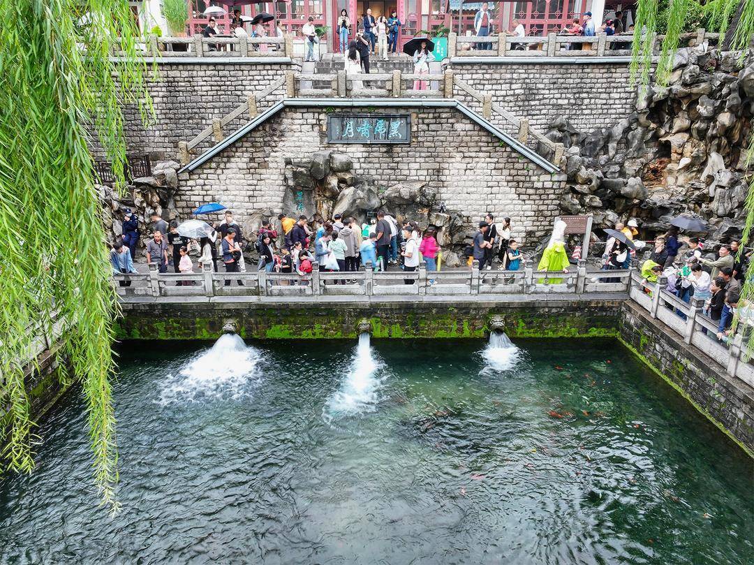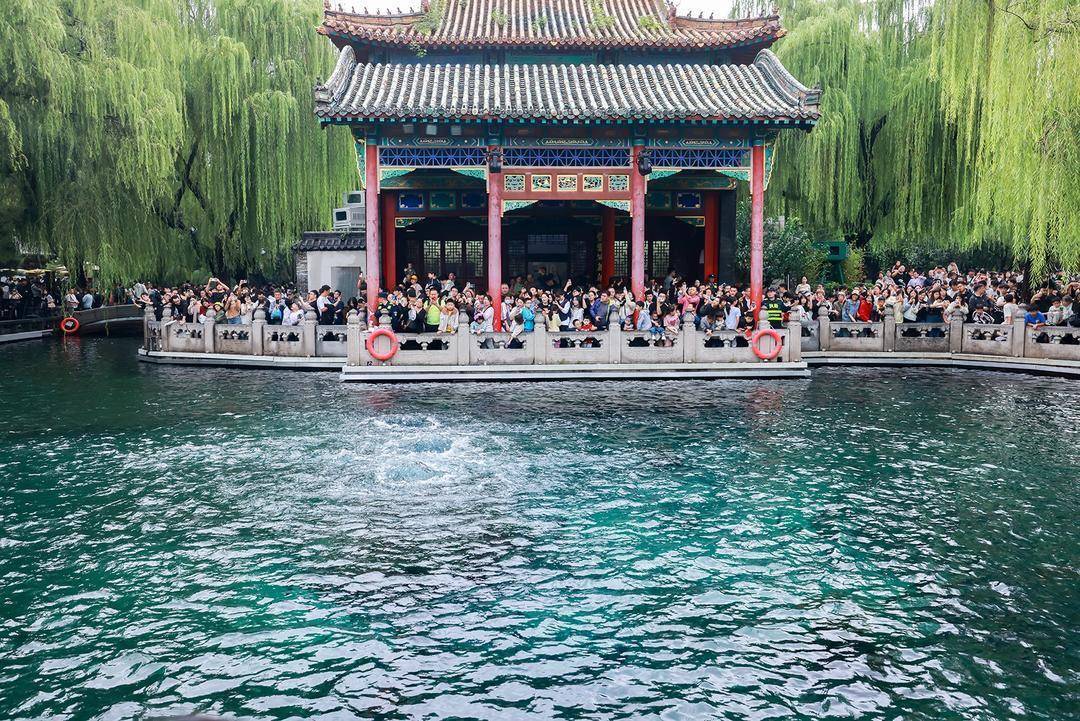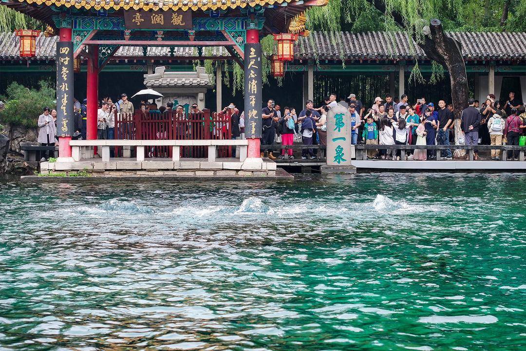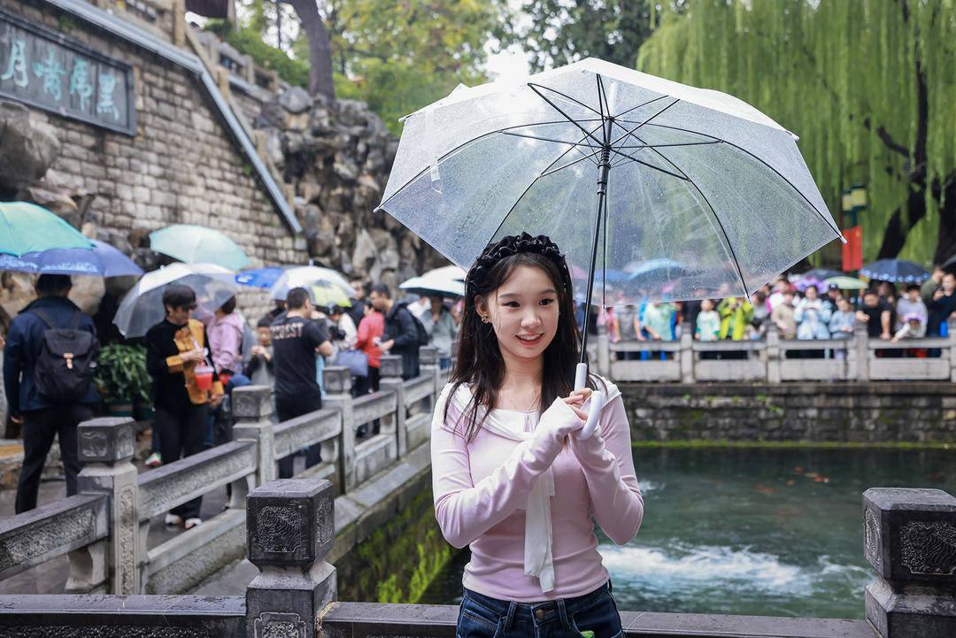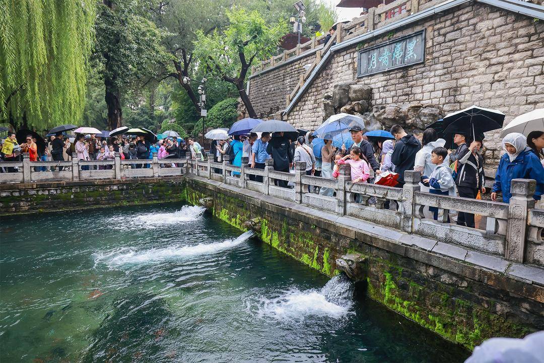 今日(10月6日)的阴雨天并没有影响游人们赏泉的兴致,看“趵突撒欢”欧维策略,听“黑虎啸吼”,观“月牙飞瀑”,别有意境,感受到中秋节泉边的生动和美妙。