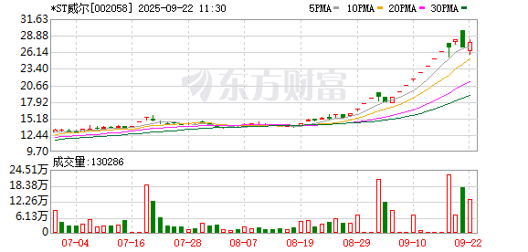 *ST威尔再度涨停,20个交易日内录得15个涨停,累计涨幅为87.24%,累计换手率为92.60%。截至10:30,该股今日成交量1045.58万股,成交金额2.80亿元,换手率7.31%。最新A股总市值达40.42亿元,A股流通市值40.33亿元。